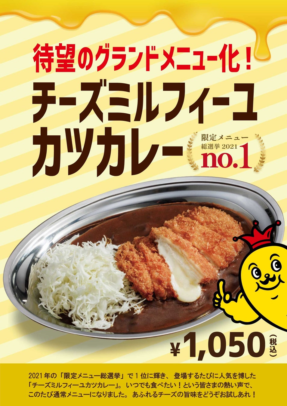 チャンピオンカレーにて、限定メニュー総選挙で1位となり、その後も限定販売される度に人気を博した「チーズミルフィーユカツカレー」が、いつでも食べられるようになりました!