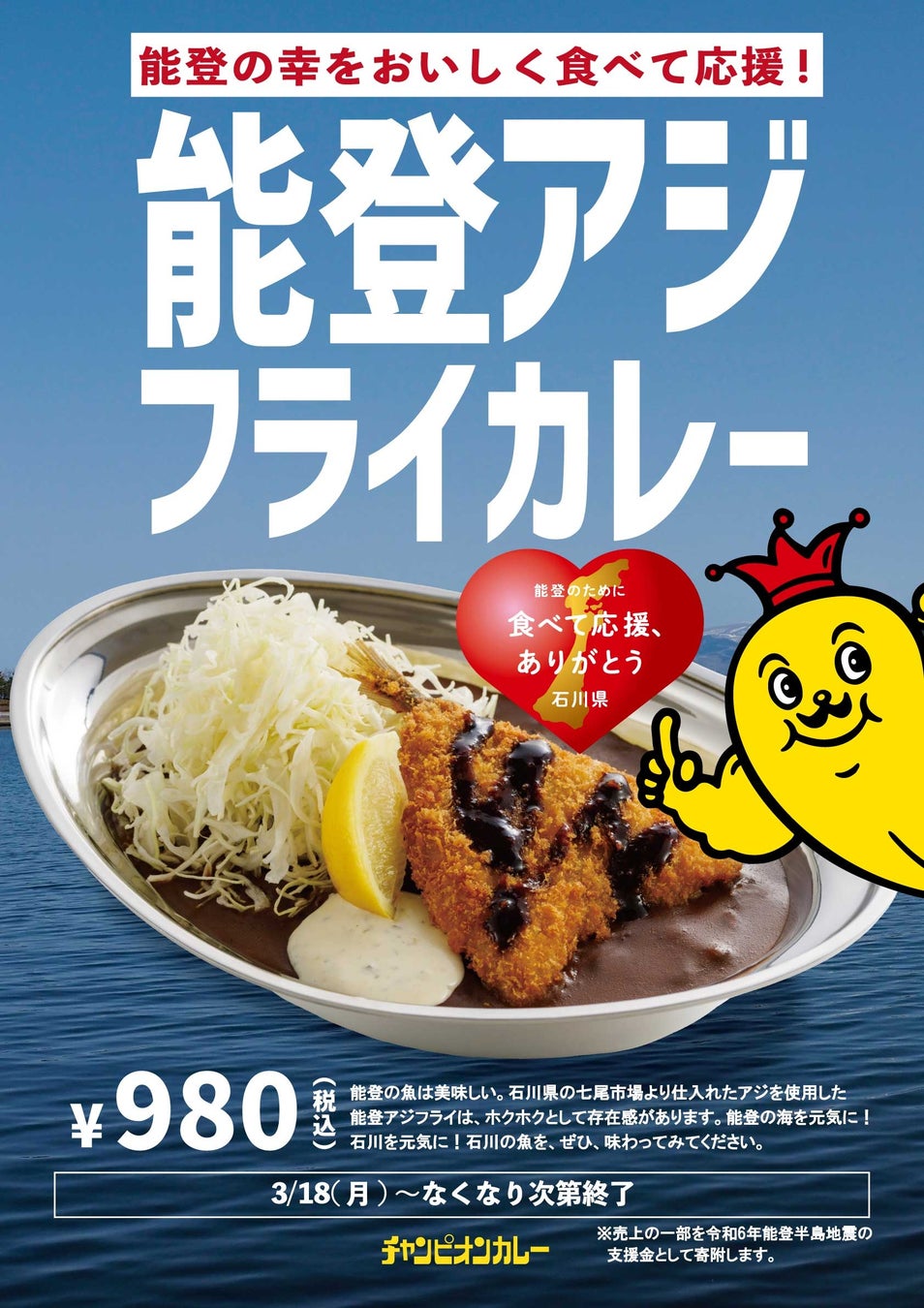 チャンピオンカレーでは、2024年3月18日(月)より、限定メニューとして「能登アジフライカレー」が販売されます。(無くなり次第終了)石川県の七尾市場より仕入れたアジを使用したアジフライをどどん!とトッピング。ホクホクの身とサクサクの衣がたまらない一品です。