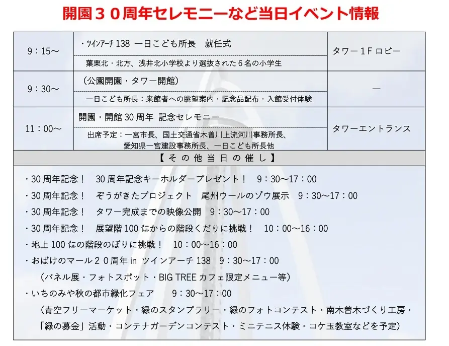 また、当日は記念品のプレゼントや記念イベントに加え、「いちのみや秋の都市緑化フェア」も開催されますので、公園内やタワーは、多くのお客様で賑わう一日となります。