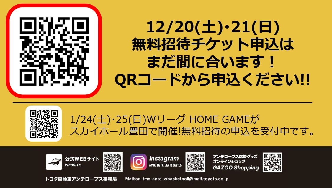 2025年12月20日(土)21日(日)、エントリオで開催される、Wリーグ(バスケットボール)稲沢大会の無料招待案内が届きました!