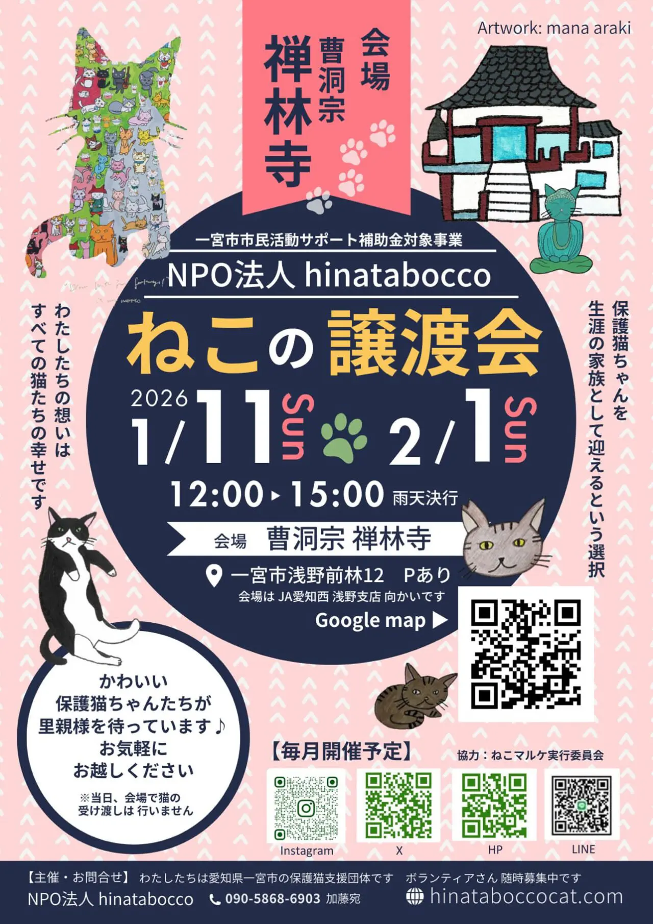 【一宮市】1月11日(日)禅林寺にて「NPO法人 hinatabocco主催 ねこの譲渡会」が開催されます!
