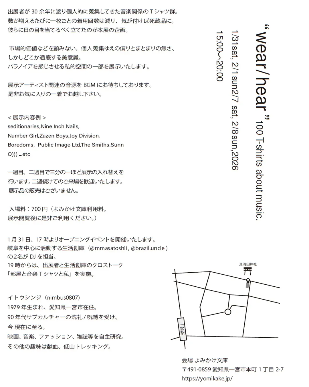 【一宮市】1月31日、2月1、7、8日の各土日よみかけ文庫内のギャラリー生存にて、音楽Tシャツを展示するイベント「wear/hear」が開催されます!