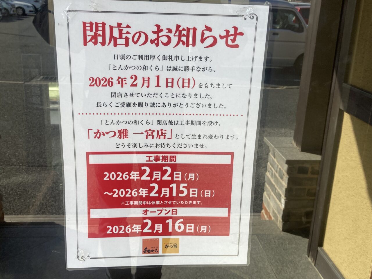 「とんかつの和くら」が2026年2月1日をもって閉店し、その後は「かつ雅 一宮店」として生まれ変わります。