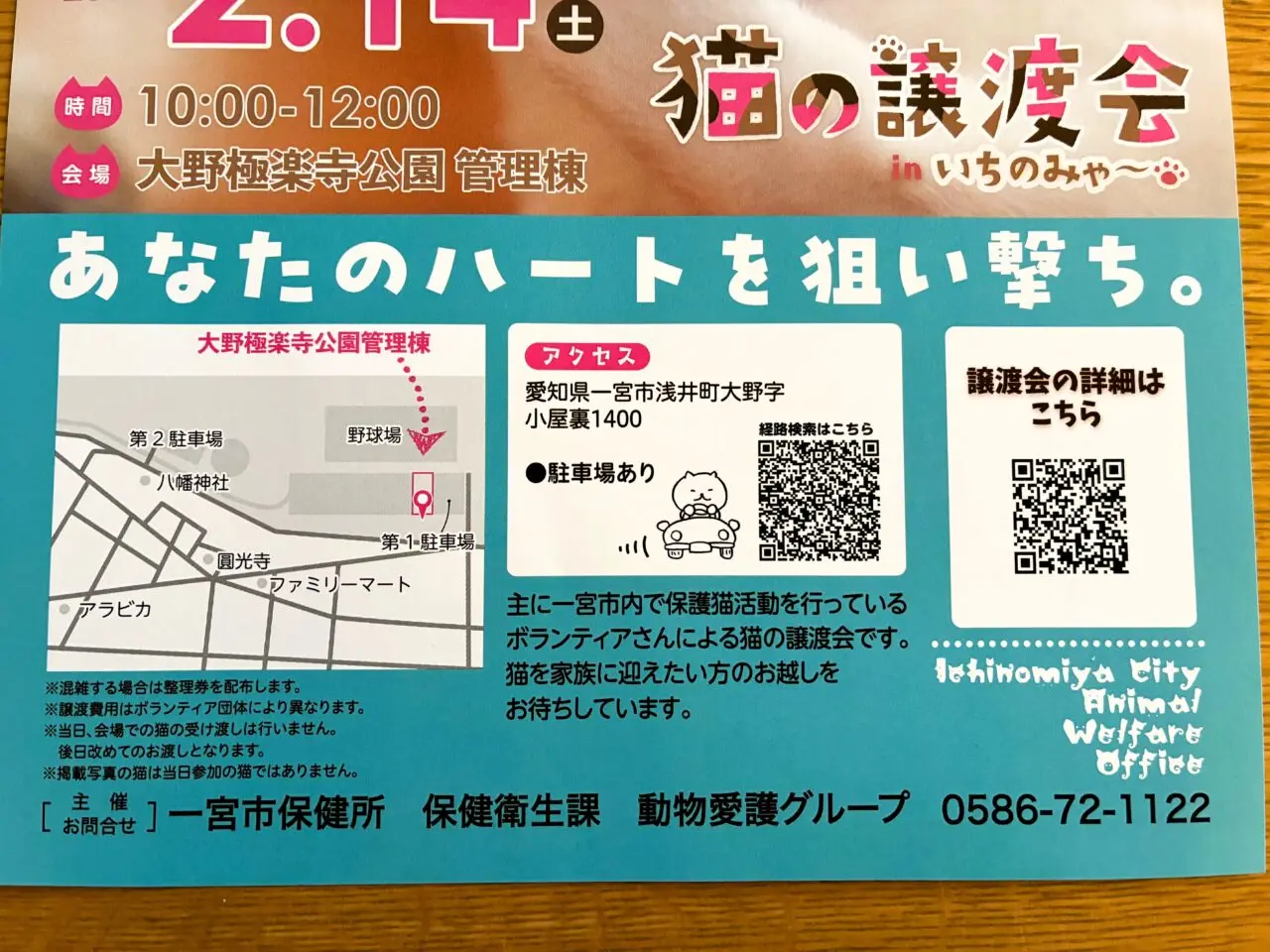 【一宮市】「猫の譲渡会 in いちのみゃ~」が2月14日(土)、大野極楽寺公園で開催されます!