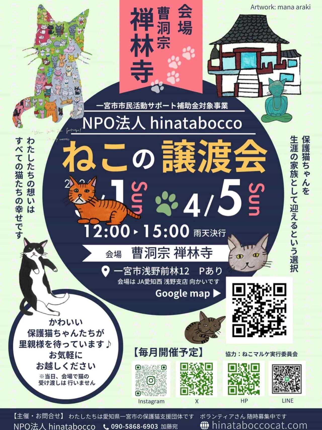 【一宮市】4月5日(日)禅林寺にて「NPO法人 hinatabocco主催 ねこの譲渡会」が開催されます!