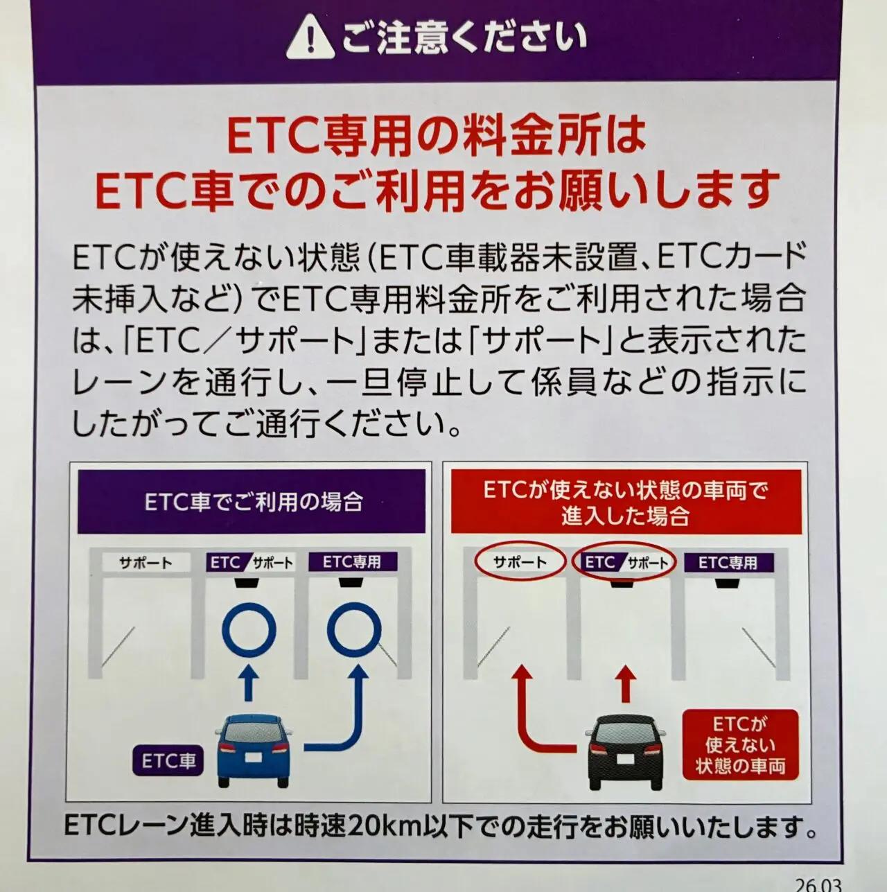 今回の変更により、対象料金所はETC車専用となり、ETC未搭載車は利用できなくなります。ETCカード未挿入や機器未設置の場合も同様です。